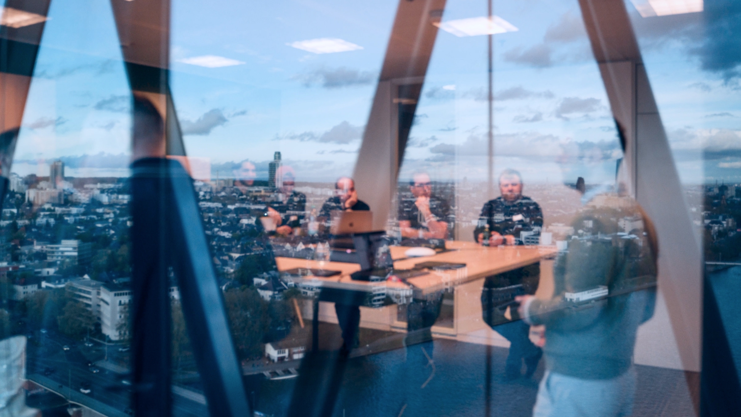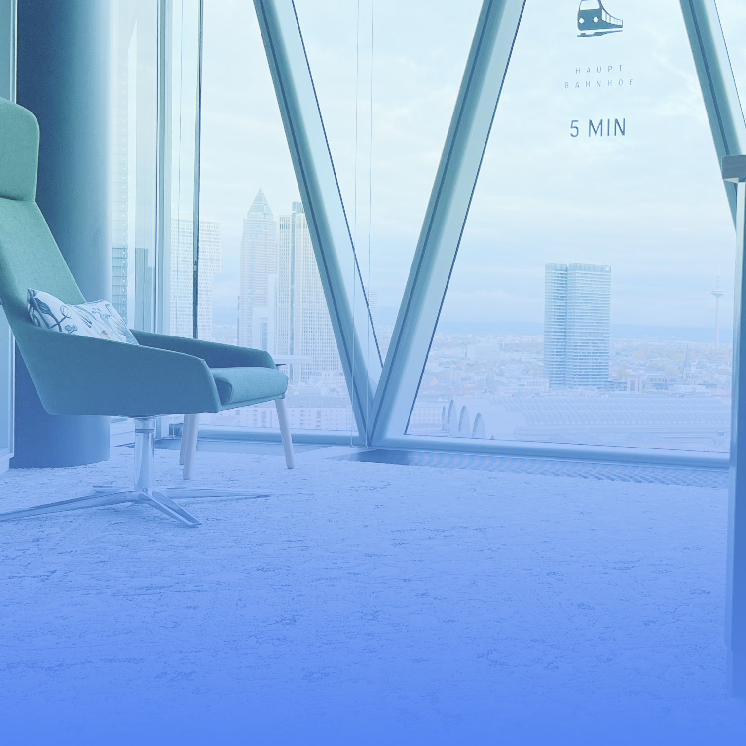Im 20. Stock des Westhafen Towers, Frankfurt am Main. Skyline-Blick über die Stadt, exklusives Setting. Für Trainings kommen wir auch zu Ihnen.